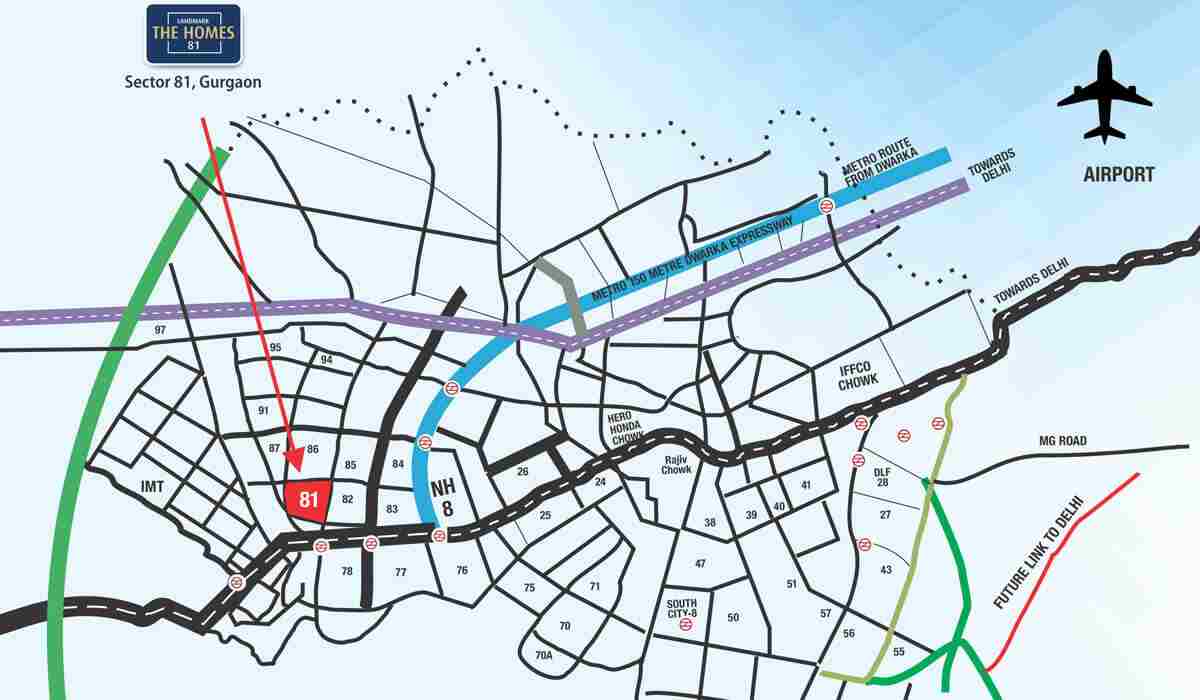 Landmark The Homes project is located in sector 81, Gurgaon. Sector 81 is amongst one of the posh locations of Gurgaon that offers excellent road connectivity with the rest of the Gurgaon and Delhi NCR. Sectors 82 and 83 are the neighboring sectors of the project.